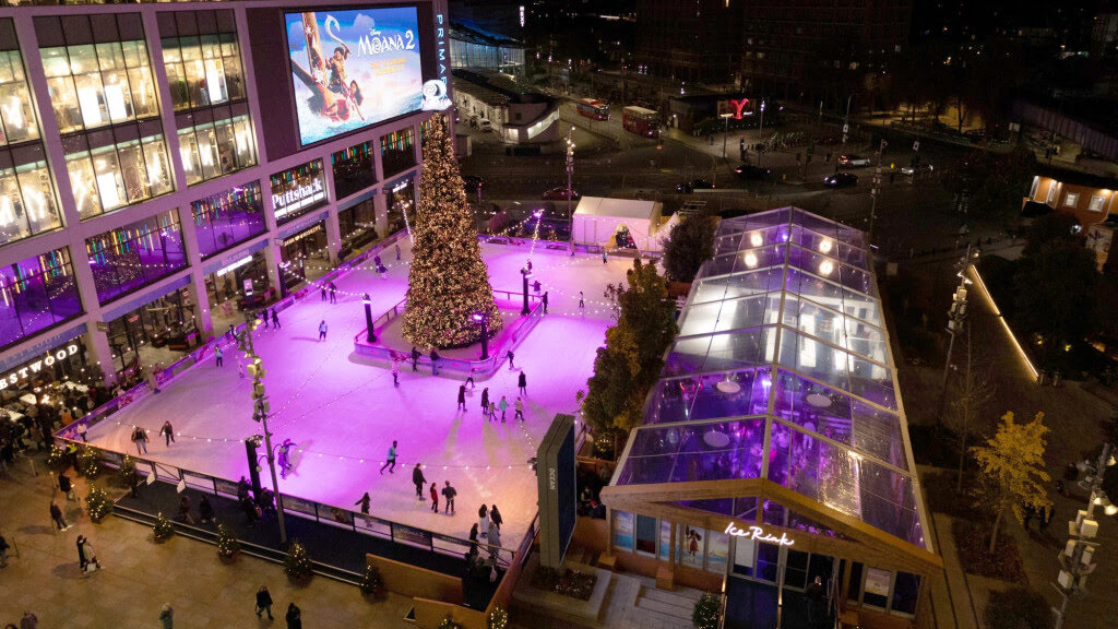 À partir du 7 novembre, vous pourrez faire le tour de trois patinoires interconnectées entourées de lumières scintillantes avec en son centre un arbre de noël haut de 10m.