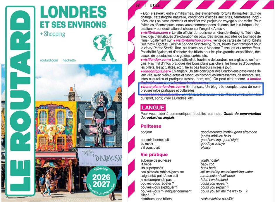 Le guide Hachette cite une nouvelle fois le blog Bons plans Londres à la page 123.